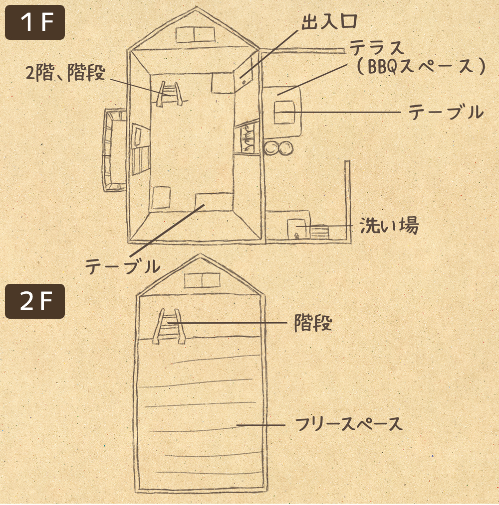 こちらのバンガローは車が真横に駐車可能。 三角屋根の3帖のロフトがあり、お子さまのにも大人気です。